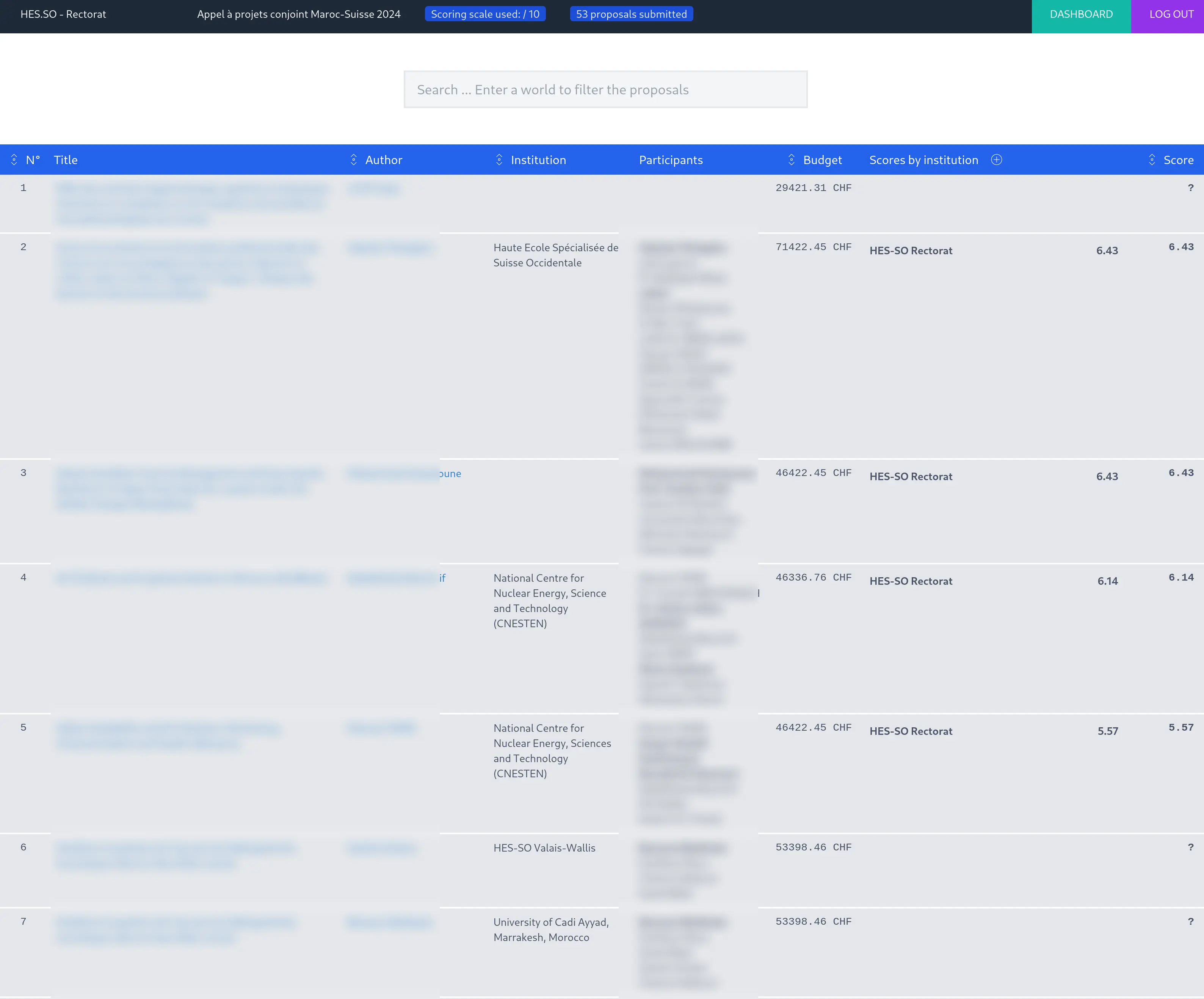 La plateforme permet d'avoir une vue d'ensemble des propositions soumises et de leurs meta-données, déposées par les candidats. Les propositions qui n'ont pas été explicitement soumises par le candidat reste à l'état brouillon et non sont pas listées dans cette vue d'ensemble.